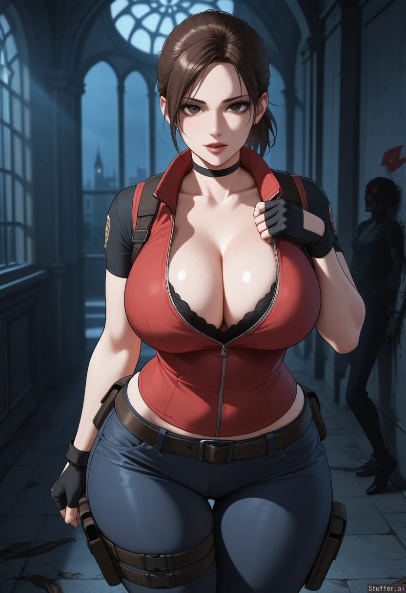 masterpiece artwork, 4K_resolution, ultra_quality, maximum_rating, detailed female body, impeccable clarity, dark gloomy shadows, sense of depth, sense of scale, (Claire_Redfield, Resident_Evil), confident, bratty, attractive, sensual, virgin, fertile, lush, gluttonous, aroused, haunted_mansion, posing, (((irresistible curvy voluptuous physique))), ((wide hips, thick gluteal mass)), (clothed),