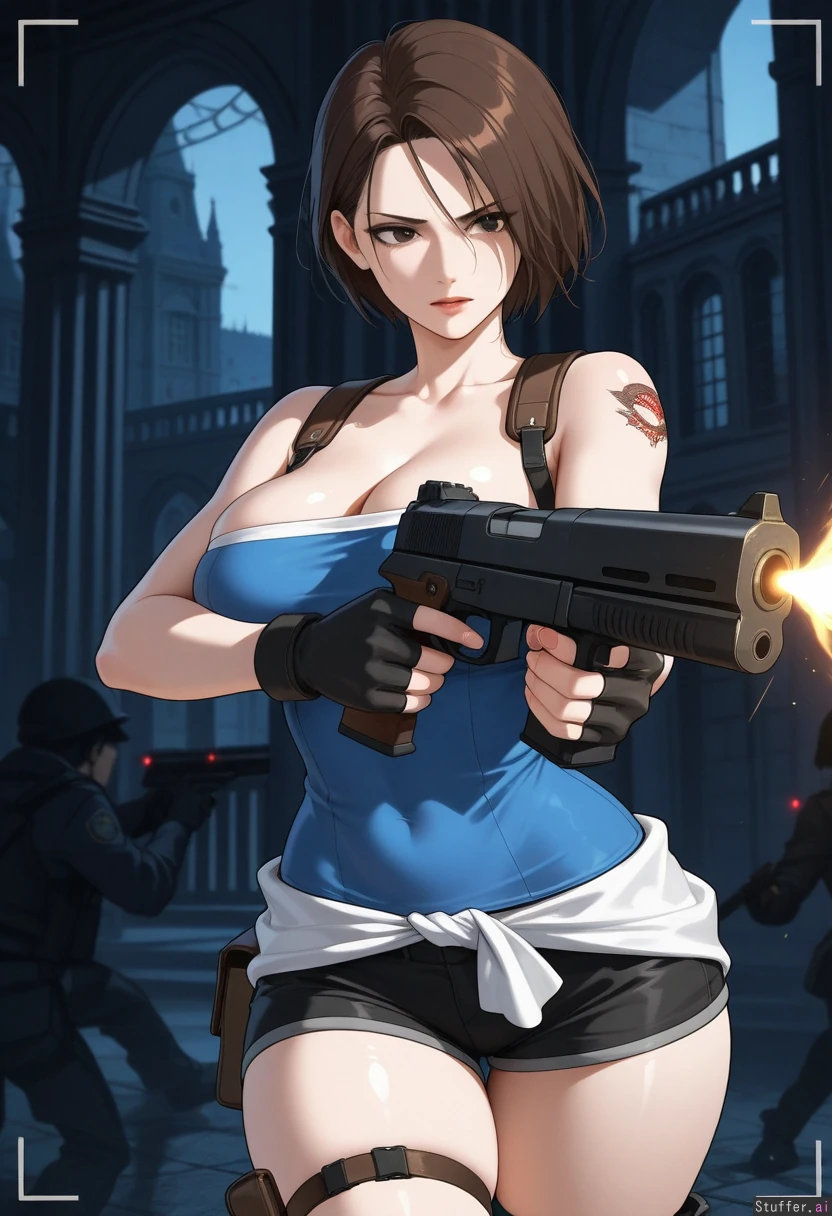 masterpiece artwork, 4K_resolution, ultra_quality, maximum_rating, detailed female body, impeccable clarity, dark gloomy shadows, sense of depth, sense of scale, (Jill_Valentine, Resident_Evil), confident, bratty, attractive, sensual, virgin, fertile, lush, capable, aroused, haunted_mansion, (shooting gun, firing_stance), (((irresistible curvy voluptuous physique))), ((wide hips, thick gluteal mass)), (clothed),