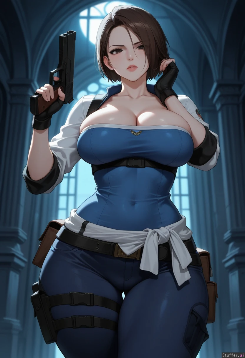 masterpiece artwork, 4K_resolution, ultra_quality, maximum_rating, detailed female body, impeccable clarity, dark gloomy shadows, sense of depth, sense of scale, solo, (Jill_Valentine, Resident_Evil), confident, stern, attractive, sensual, virgin, fertile, lush, capable, aroused, haunted_mansion, combat_stance, side view, (((irresistible curvy voluptuous physique))), ((wide hips, thick gluteal mass)), (clothed),