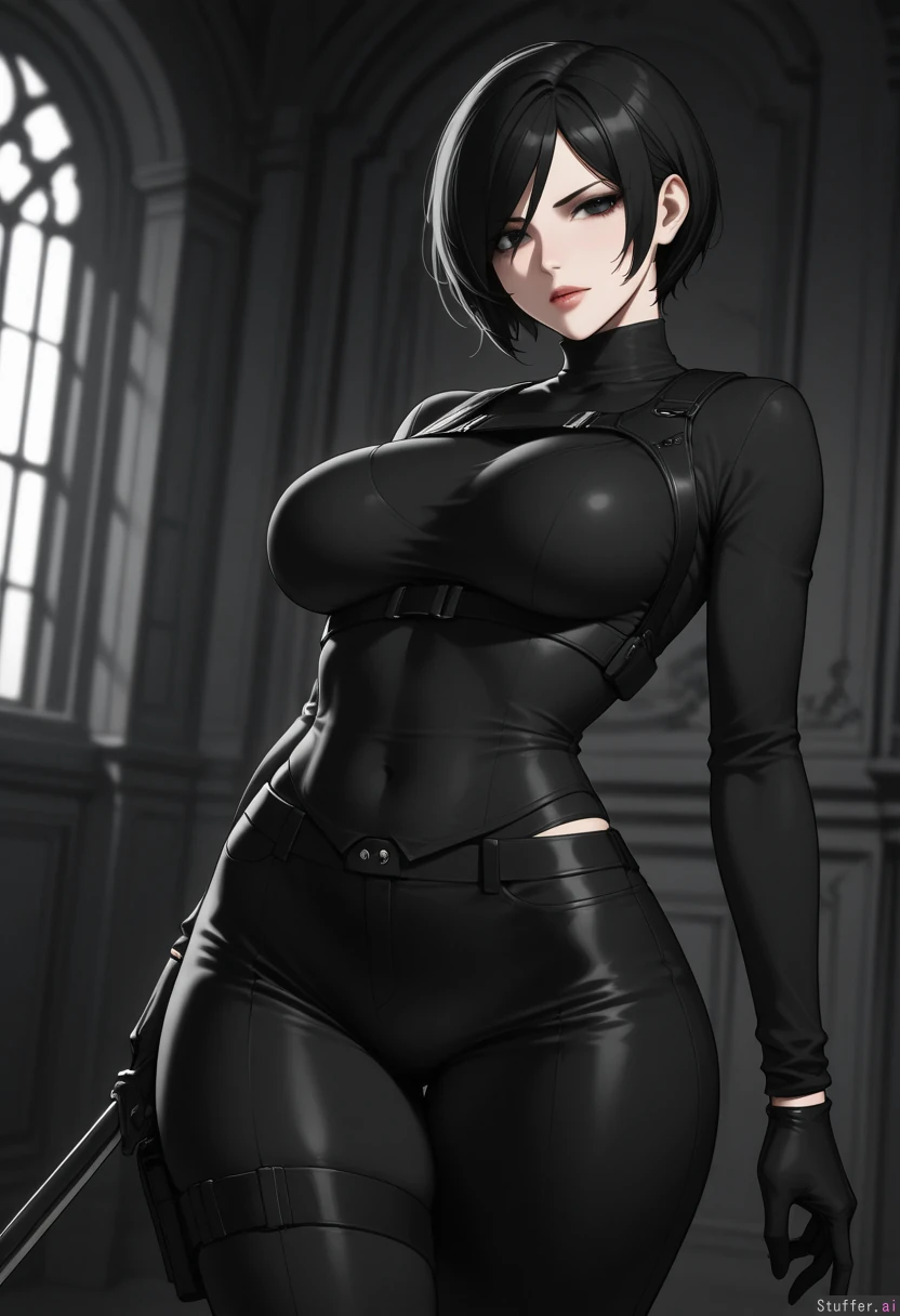 masterpiece artwork, 4K_resolution, ultra_quality, maximum_rating, detailed female body, impeccable clarity, dark gloomy shadows, sense of depth, sense of scale, solo, (Ada_Wong, Resident_Evil), confident, stern, attractive, sensual, virgin, fertile, lush, capable, aroused, haunted_mansion, combat_stance, side view, (((irresistible curvy voluptuous physique))), ((wide hips, thick gluteal mass)), (clothed),