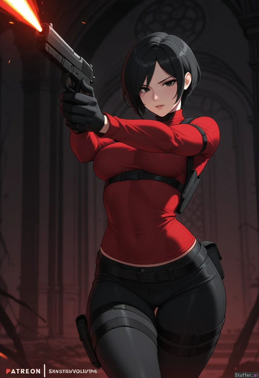masterpiece artwork, 4K_resolution, ultra_quality, maximum_rating, detailed female body, impeccable clarity, dark gloomy shadows, sense of depth, sense of scale, solo, (Ada_Wong, Resident_Evil), confident, stern, attractive, sensual, virgin, fertile, lush, capable, aroused, haunted_mansion, combat_stance, firing_gun side view, (((irresistible curvy voluptuous physique))), ((wide hips, thick gluteal mass)), (clothed),