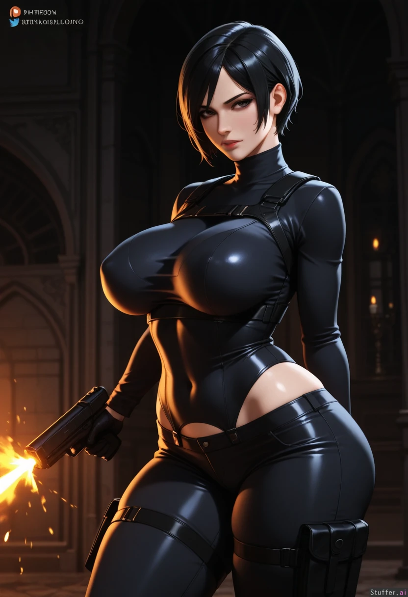 masterpiece artwork, 4K_resolution, ultra_quality, maximum_rating, detailed female body, impeccable clarity, dark gloomy shadows, sense of depth, sense of scale, solo, (Ada_Wong, Resident_Evil), confident, stern, attractive, sensual, virgin, fertile, lush, capable, aroused, haunted_mansion, zombies, action scene, firing_gun, side view, (((sexy curvy voluptuous physique))), ((wide hips, thick gluteal mass)), (clothed),