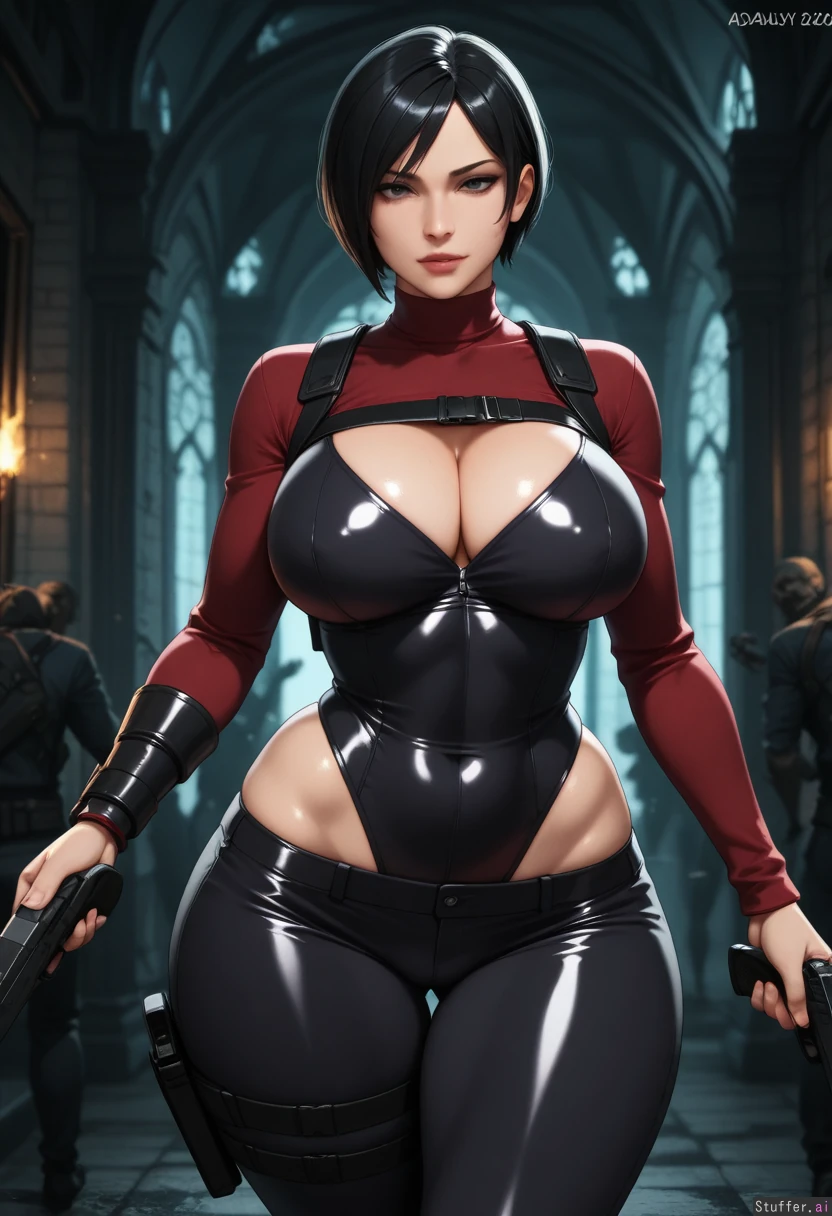 solo, (Ada_Wong, Resident_Evil), confident, stern, attractive, sensual, virgin, fertile, lush, capable, aroused, haunted_mansion, zombies, action scene, firing_gun, (((sexy curvy voluptuous physique))), ((wide hips, thick gluteal mass)), (clothed),