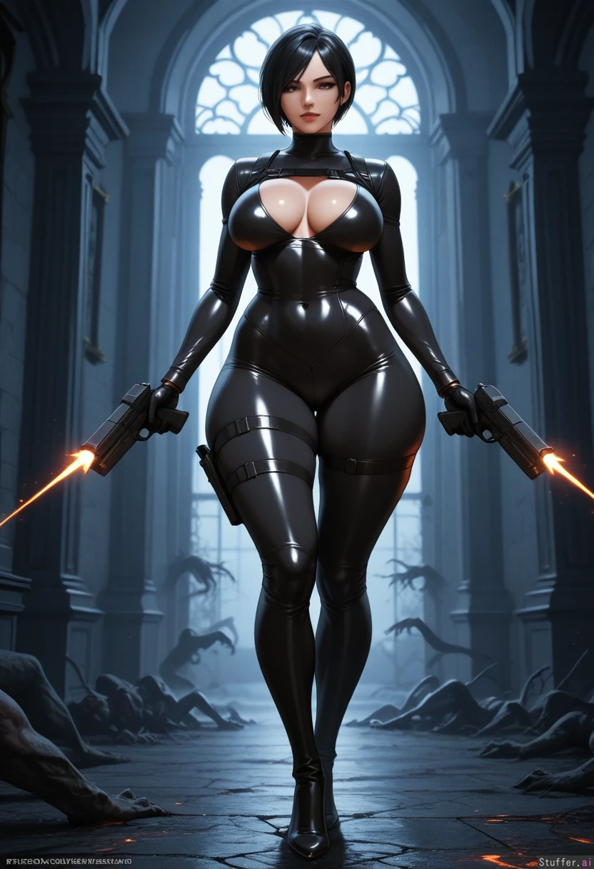 masterpiece artwork, 4K_resolution, ultra_quality, maximum_rating, detailed female body, impeccable clarity, dark gloomy shadows, sense of depth, sense of scale, solo, (Ada_Wong, Resident_Evil), haunted_mansion, zombies, action scene, firing_gun, (((sexy curvy voluptuous physique))), ((wide hips, thick gluteal mass)), (clothed),