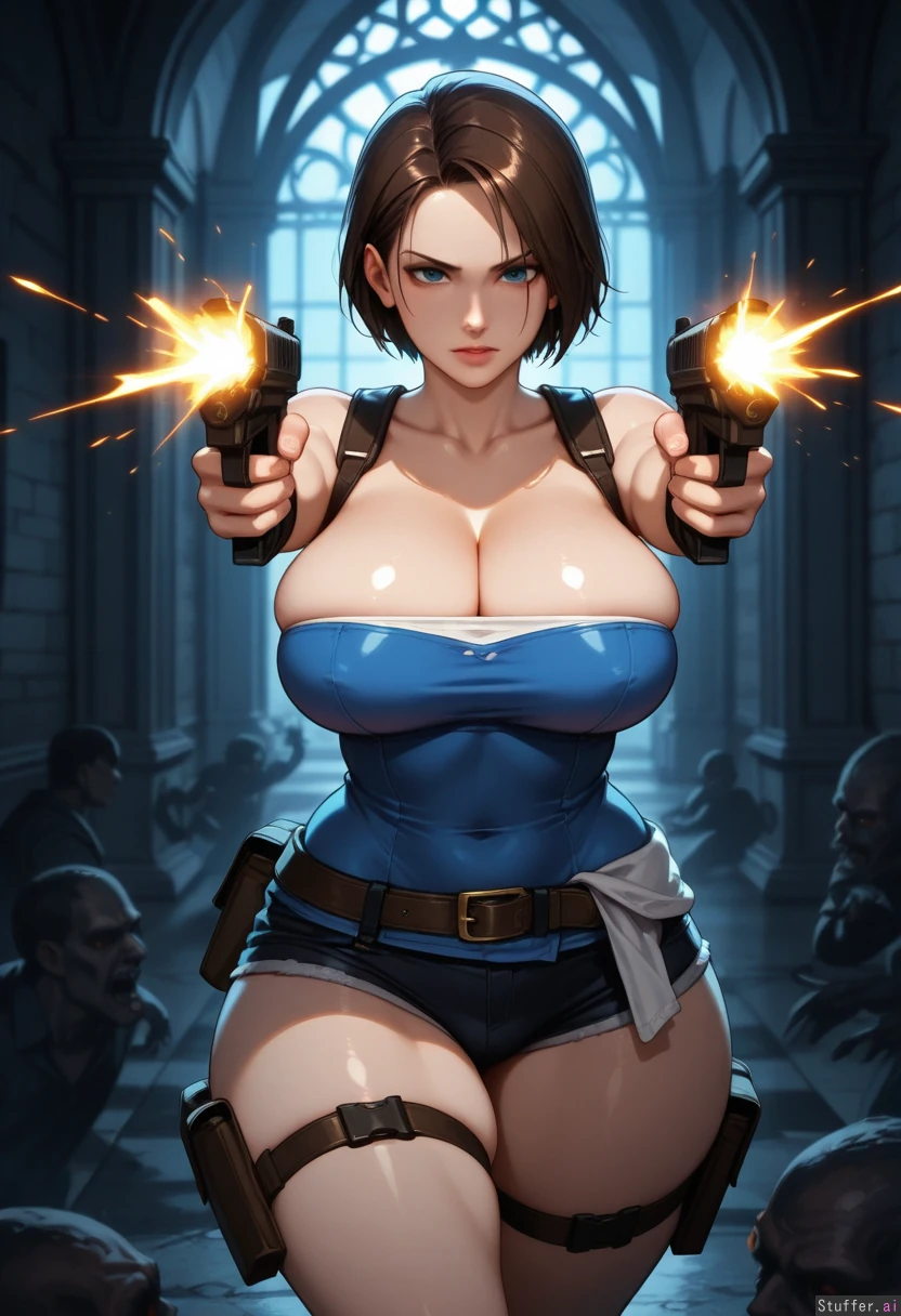 masterpiece artwork, 4K_resolution, ultra_quality, maximum_rating, detailed female body, impeccable clarity, dark gloomy shadows, sense of depth, sense of scale, solo, (Jill_Valentine, Resident_Evil), confident, stern, attractive, impressive, virgin, fertile, lush, capable, aroused, haunted_mansion, zombies, (action_scene, firing_stance), (((sexy curvy voluptuous physique))), ((wide hips, thick gluteal mass)), (clothed),