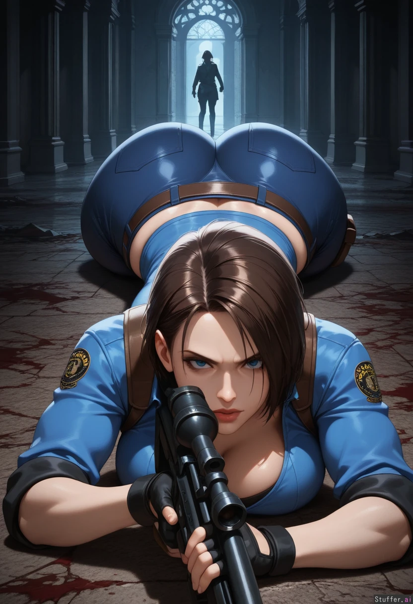 masterpiece artwork, 4K_resolution, ultra_quality, maximum_rating, detailed female body, impeccable clarity, dark gloomy shadows, sense of depth, sense of scale, solo, (Jill_Valentine, Resident_Evil), confident, stern, attractive, impressive, brave, bold, heroic, capable, marksman, sniper, haunted_mansion, zombies, (action_scene, prone_stance, sniper_rifle), (((sexy curvy voluptuous physique))), ((wide hips, thick gluteal mass)), (clothed),