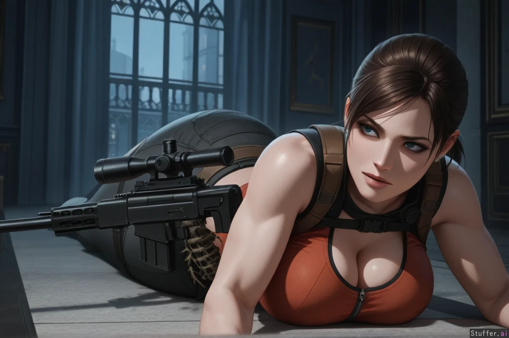 masterpiece artwork, 4K_resolution, ultra_quality, maximum_rating, detailed female body, impeccable clarity, dark gloomy shadows, sense of depth, sense of scale, solo, (Claire_Redfield, Resident_Evil), confident, focused, attractive, impressive, brave, bold, heroic, capable, haunted_mansion, balcony, zombies, (action_scene, prone_stance, sniper_rifle), (((sexy curvy voluptuous physique))), ((wide hips, thick gluteal mass)), (clothed),