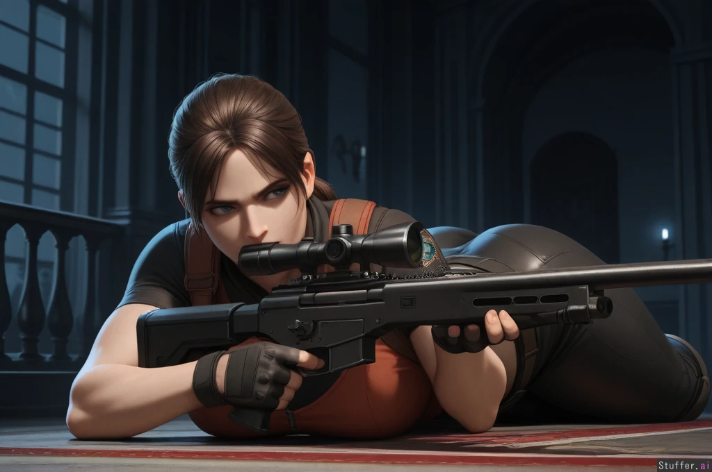 masterpiece artwork, 4K_resolution, ultra_quality, maximum_rating, detailed female body, impeccable clarity, dark gloomy shadows, sense of depth, sense of scale, solo, (Claire_Redfield, Resident_Evil), confident, focused, attractive, impressive, brave, bold, heroic, capable, haunted_mansion, balcony, zombies, (action_scene, prone_stance, sniper_rifle), (((sexy curvy voluptuous physique))), ((wide hips, thick gluteal mass)), (clothed),