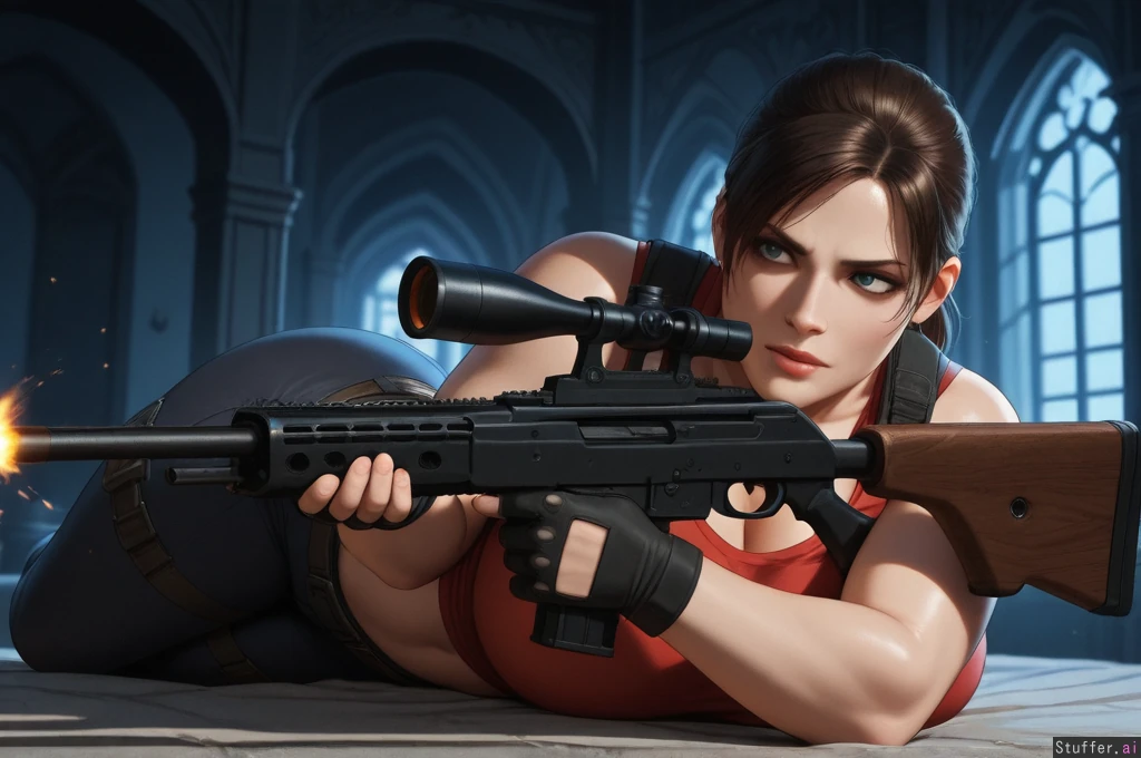 masterpiece artwork, 4K_resolution, ultra_quality, maximum_rating, detailed female body, impeccable clarity, dark gloomy shadows, sense of depth, sense of scale, solo, (Claire_Redfield, Resident_Evil), confident, focused, attractive, impressive, brave, bold, heroic, capable, haunted_mansion balcony, zombies, (action_scene, prone_stance, firing sniper_rifle), (((sexy curvy voluptuous physique))), ((wide hips, thick gluteal mass)), (clothed),