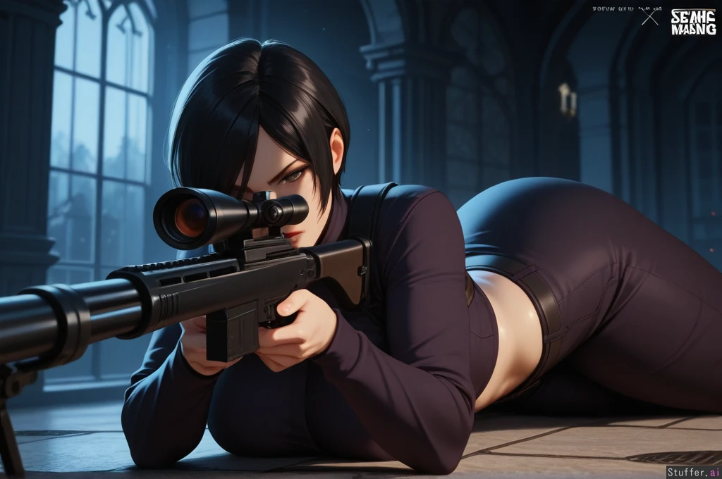 masterpiece artwork, 4K_resolution, ultra_quality, maximum_rating, detailed female body, impeccable clarity, dark gloomy shadows, sense of depth, sense of scale, solo, (Ada_Wong, Resident_Evil), confident, focused, attractive, impressive, brave, bold, heroic, capable, haunted_mansion, sniper_nest, zombies, (prone_stance, aiming sniper_rifle), (((sexy curvy voluptuous physique))), ((wide hips, thick gluteal mass)), (clothed),