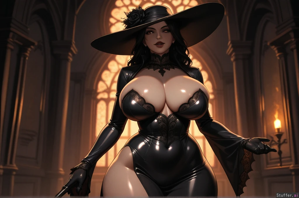 masterpiece artwork, 4K_resolution, ultra_quality, maximum_rating, detailed female body, impeccable clarity, dark gloomy shadows, sense of depth, sense of scale, solo, (Lady Dimitrescu, Resident_Evil), haunted_mansion, (((sexy curvy voluptuous physique))), ((wide hips, thick gluteal mass)), (clothed),