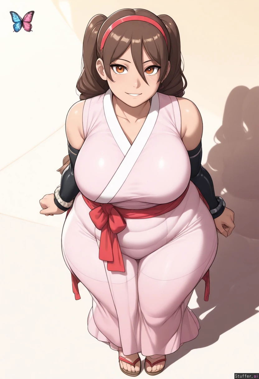 (((Krekkov (artist), KAMII MOMORU(artist), KipTeiTei(artist), Lewdlemage(artist)))), ((((highly detailed, best quality, perfect lighting, vibrant colors, shadow, perfect shading, perfect anatomy, perfect proportions, art style (anime)))), (Chch Akimichi from Boruto), dark-skinned, amber colored eyes, like her mother. brown hair, two_spiky_ponytails, hair-band, bangs hanging over her left eye, sleeveless pink kimono, red sash with butterfly decorations tied around her waist, a pair of black arm warmers , sandals, solo, (obese:1.4)