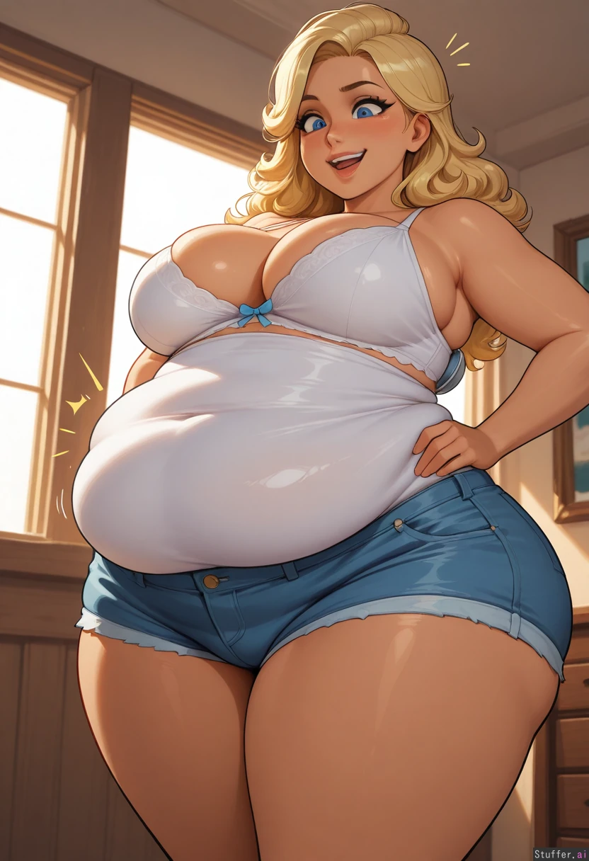 (jiggly(artist):1.5). (kamii momoru(artist):1.1). (kittew(artist):1.1). (21 year old, Blond hair, blue eyes, tan skin, cute face, cute) Ssbbw, fat rolls, obese, huge fat belly hanging, wide hips, massive thick thighs, perky bouncy big breasts, bouncy massive butt, fat legs, deep naval, Sexy, excited, shocked, confident Hands on hips, feminine pose, leaning forward, Denim shorts, white bra (Weight gain:2.5) best quality. high rating. high res. masterpiece. uhd. beautiful lighting.