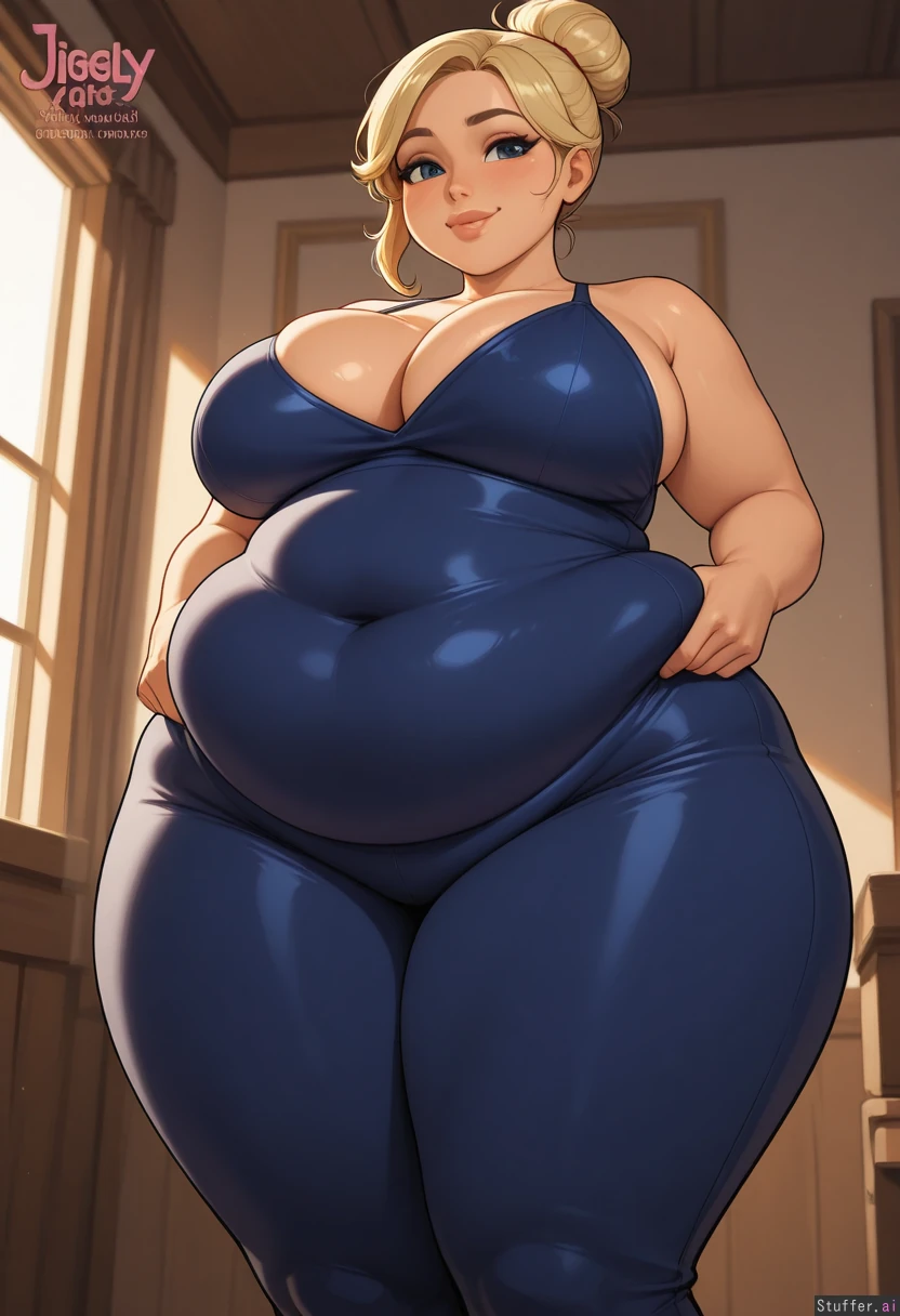 (jiggly(artist):1.5). (kamii momoru(artist):1.1). (kittew(artist):1.1). (21 year old, Blond hair, messy bun, blue eyes, tan skin, cute face, cute) Ssbbw, fat rolls, obese, huge fat belly, massive hips, massive thick thighs, perky bouncy big breasts, bouncy massive butt, fat legs, deep naval, overweight, bbw, 3000 lbs woman, overweight, chubby, fat, thick, huge cleavage, thick thighs Sexy, confident, sensual Feminine pose, standing (Weight gain:2.1) best quality. high rating. high res. masterpiece. uhd. beautiful lighting.
