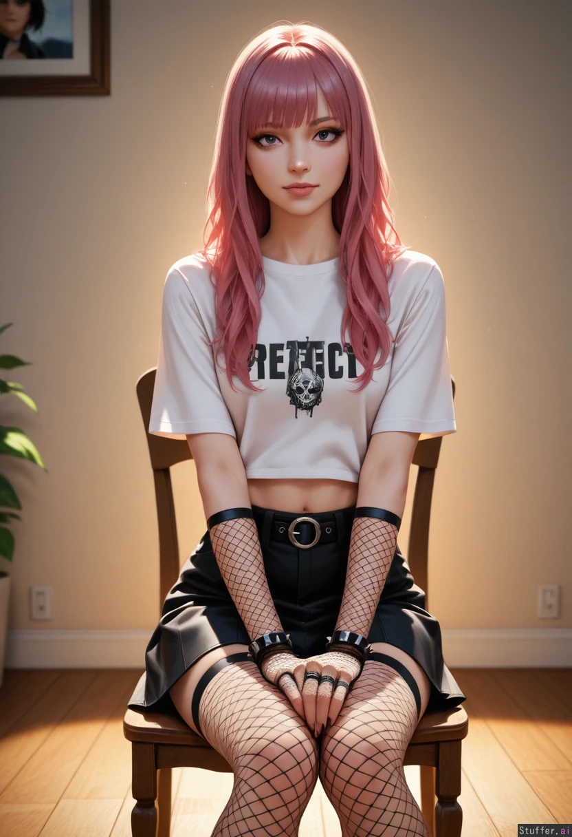 (((Ultra HD), (perfect lighting), photorealistic), HDR, best quality, masterpiece, hyper detailed), pink hair 1woman, long hair, beautiful face, girl, emo girl, punk girl, miniskirt, blouse, fishnets_legwear, fishnets_gloves sitting, on chair, professional_photo_studio, narrow_waist, extra thin_body, exposed stomach, mascara,