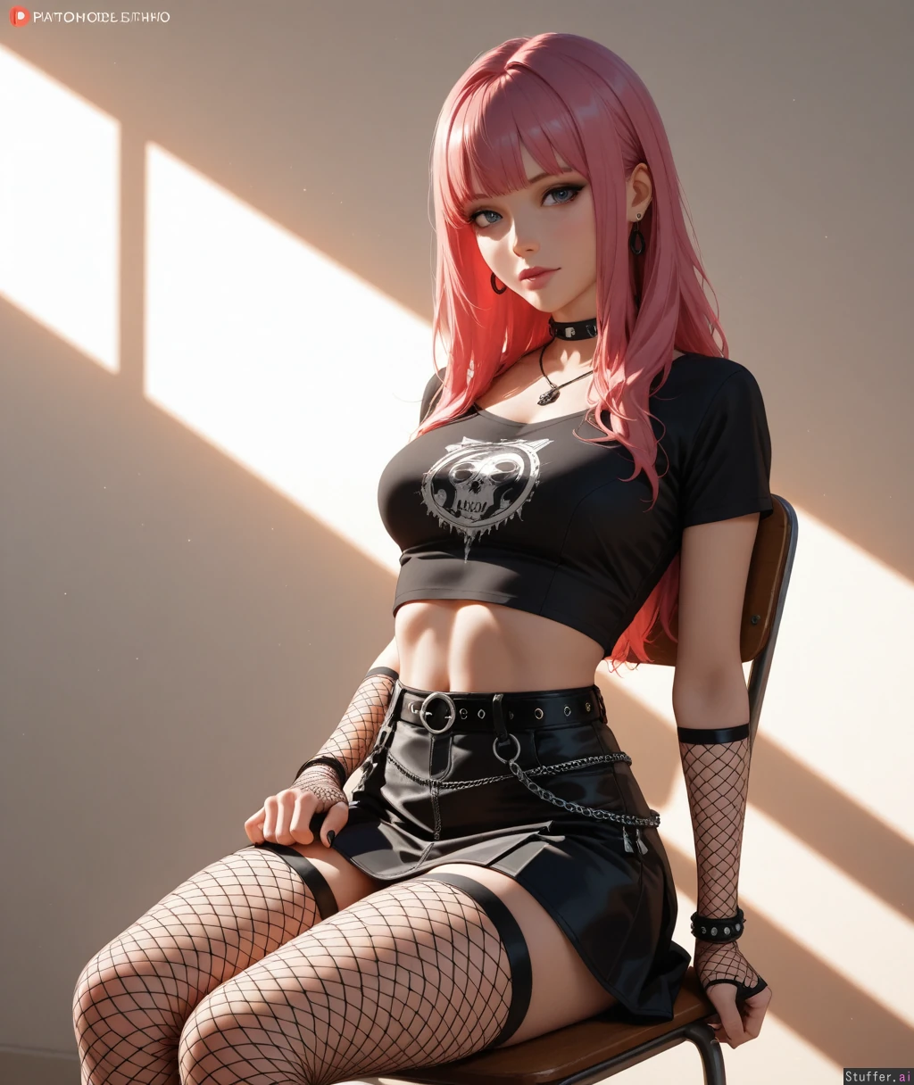 (((Ultra HD), (perfect lighting), photorealistic), HDR, best quality, masterpiece, hyper detailed), pink hair 1woman, long hair, beautiful face, girl, emo girl, punk girl, photomodel, miniskirt, blouse, fishnets_legwear, fishnets_gloves sitting, on chair, professional_photo_studio, white space, narrow_waist, hyper thin_body:1.5, exposed stomach, mascara, wide_shot