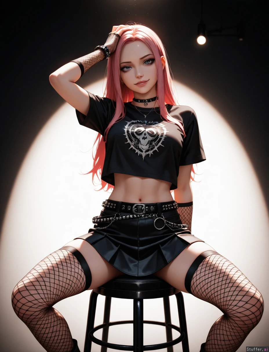(((Ultra HD), (perfect lighting), photorealistic), professional light, HDR, best quality, masterpiece, hyper detailed), pink hair 1woman, long hair, beautiful face, girl, emo girl, punk girl, photomodel, miniskirt, blouse, fishnets_legwear, fishnets_gloves sitting, on stool, professional photo_studio, white space, narrow_waist, hyper thin_body:1.5, exposed stomach, smirk, mascara, (wide_shot:1.5), hand_on_head
