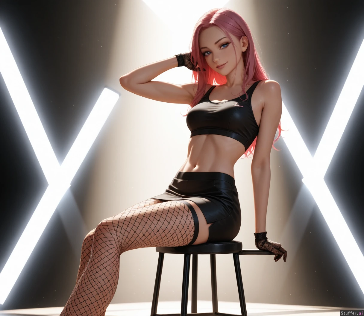 (((Ultra HD), (perfect lighting), photorealistic), professional light, HDR, best quality, masterpiece, hyper detailed), pink hair 1woman, long hair, beautiful face, girl, , photomodel, miniskirt, blouse, fishnets_legwear, fishnets_gloves sitting, on stool, professional photo_studio, white space, narrow_waist:1.5, (thin_body:1.5), exposed stomach, smirk, mascara, (wide_shot:1.5), hand_behind_head