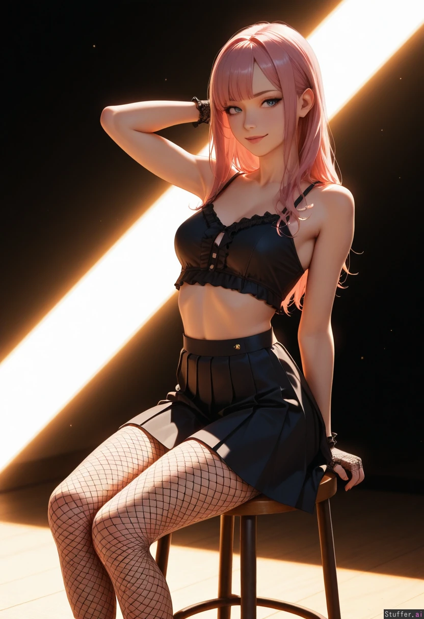 (((Ultra HD), (perfect lighting), photorealistic), professional light, HDR, best quality, masterpiece, hyper detailed), pink hair 1woman, long hair, beautiful face, girl, , photomodel, pleated skirt, (buttoned blouse), fishnets_legwear, fishnets_gloves sitting, on stool, professional photo_studio, white space, narrow_waist:1.5, (thin_body:1.5), exposed stomach, smirk, mascara, (wide_shot:1.5), hand_behind_head