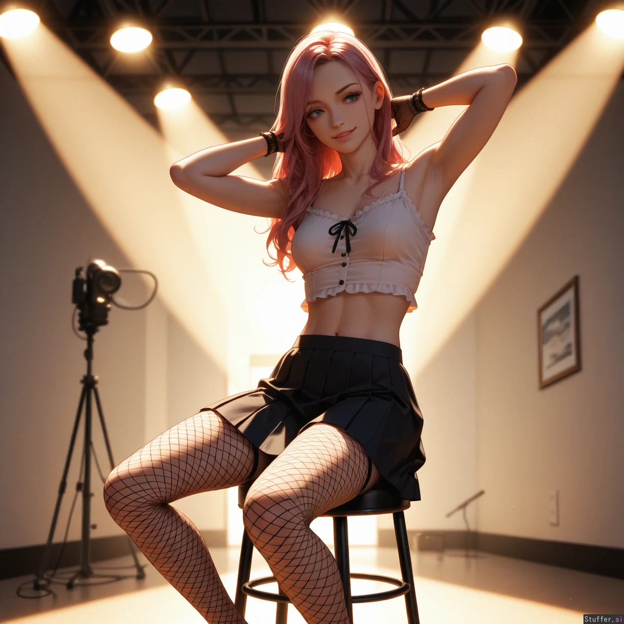 (((Ultra HD), (perfect lighting), photorealistic), professional light, HDR, best quality, masterpiece, hyper detailed), pink hair 1woman, long hair, beautiful face, girl, , photomodel, pleated skirt, (buttoned blouse), fishnets_legwear, fishnets_gloves sitting, on stool, professional photo_studio, white space, narrow_waist:1.5, (thin_body:1.5), exposed stomach, smirk, mascara, (wide_shot:1.5), hand_behind_head
