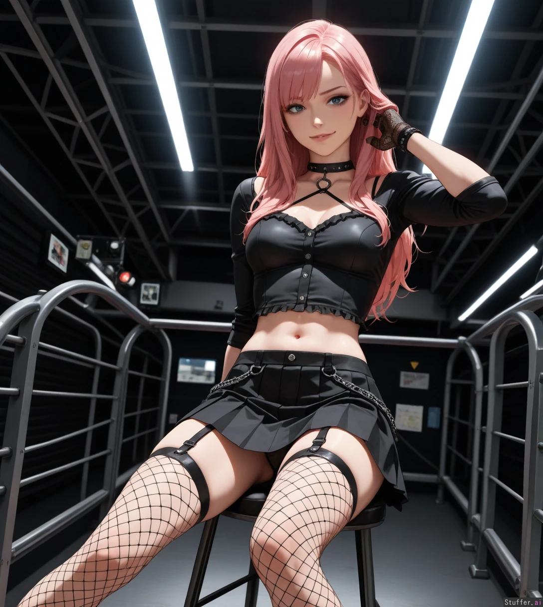 (((Ultra HD), (perfect lighting), photorealistic), professional light, HDR, best quality, masterpiece, hyper detailed), pink hair 1woman, long hair, beautiful face, girl, emo girl, punk girl, photomodel, pleated skirt, (buttoned blouse), fishnets_legwear, fishnets_gloves, visible panties straps, sitting, on stool, professional photo_studio, white space, narrow_waist:1.5, (thin_body:1.5), exposed stomach, smirk, mascara, (wide_shot:1.5), hand_behind_head
