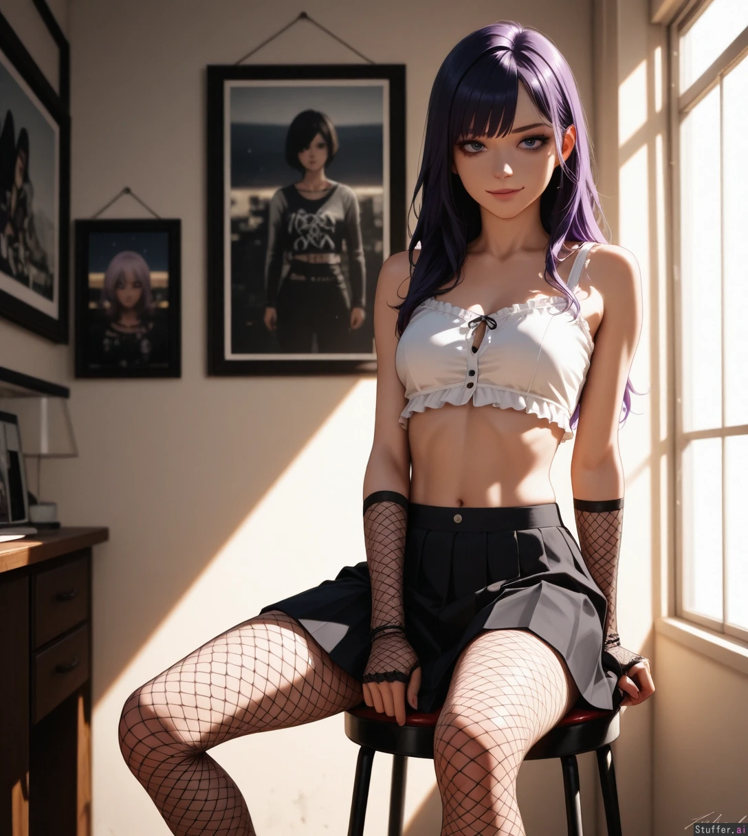 (((Ultra HD), (perfect lighting), photorealistic), professional light, HDR, best quality, masterpiece, hyper detailed), violet hair 1woman, long hair, beautiful face, girl, emo girl, punk girl, photomodel, pleated skirt, (buttoned blouse), fishnets_legwear, fishnets_gloves, sitting, on stool, professional photo_studio, white space, narrow_waist:1.5, (thin_body:1.5), exposed stomach, smirk, mascara, (wide_shot:1.5),