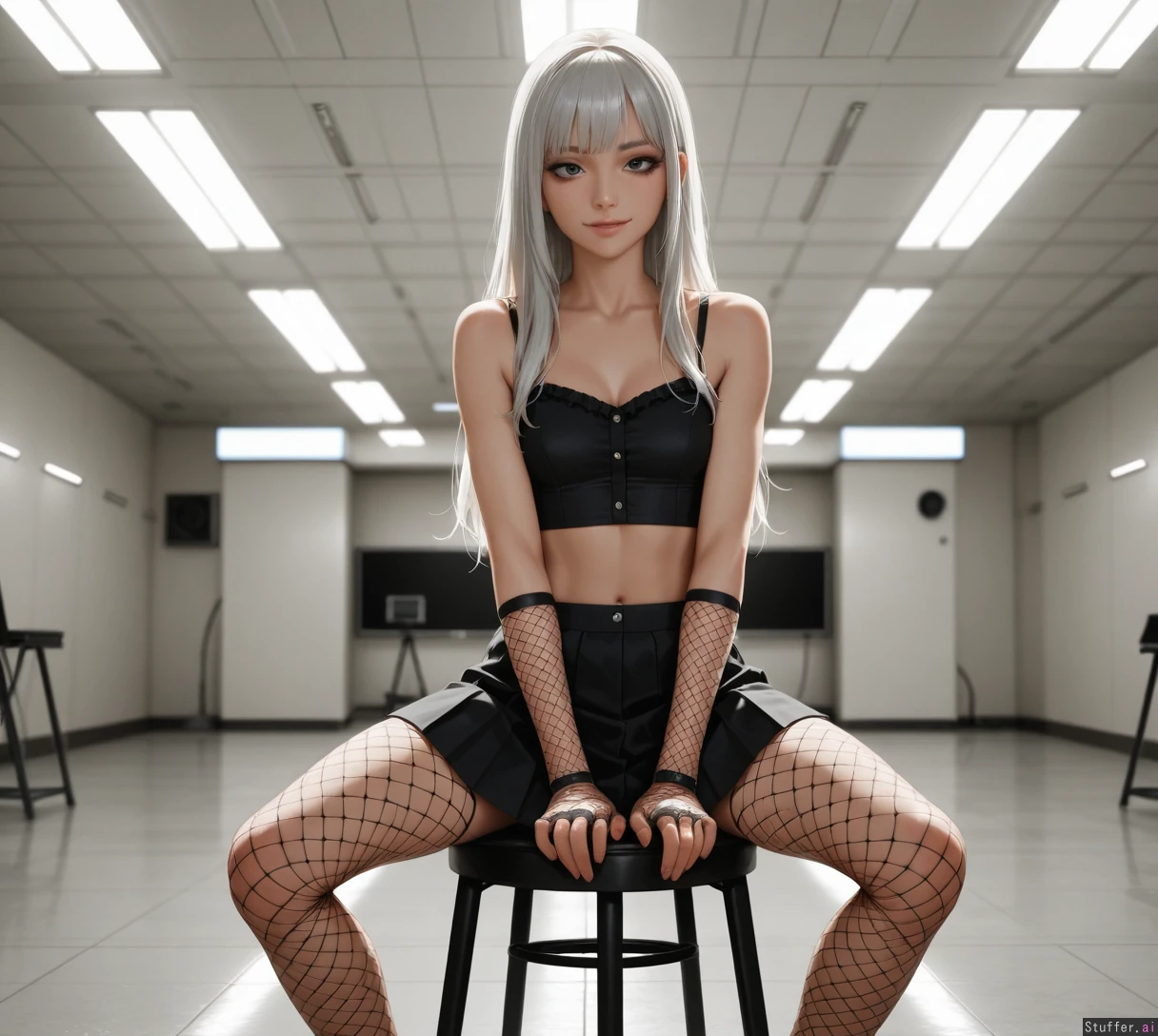 (((Ultra HD), (perfect lighting), photorealistic), professional light, HDR, best quality, masterpiece, hyper detailed), ash hair 1woman, long hair, beautiful face, girl, emo girl, punk girl, photomodel, pleated skirt, (buttoned blouse), fishnets_legwear, fishnets_gloves, sitting, on stool, professional photo_studio, white space, narrow_waist:1.5, (thin_body:1.5), exposed stomach, smirk, mascara, (wide_shot:1.5),