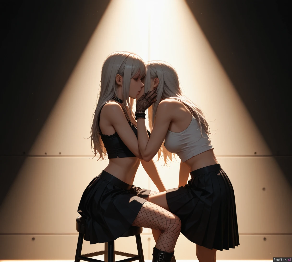 (((Ultra HD), (perfect lighting), photorealistic), professional light, HDR, best quality, masterpiece, hyper detailed), ash hair 1woman, long hair, beautiful face, girl, emo girl, punk girl, photomodel, pleated skirt, (buttoned blouse), fishnets_legwear, fishnets_gloves, sitting, on stool, professional photo_studio, white space, narrow_waist:1.5, (thin_body:1.5), exposed stomach, scared, mascara, (wide_shot:1.5), oral_sex