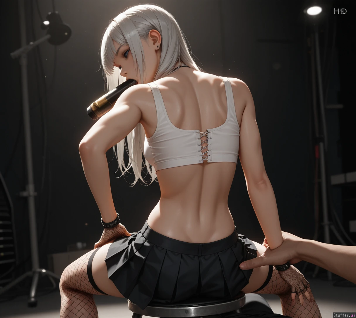 (((Ultra HD), (perfect lighting), photorealistic), professional light, HDR, best quality, masterpiece, hyper detailed), ash hair 1woman, long hair, beautiful face, girl, emo girl, punk girl, photomodel, pleated skirt, (buttoned blouse), fishnets_legwear, fishnets_gloves, sitting, on stool, professional photo_studio, white space, narrow_waist:1.5, (thin_body:1.5), mascara, (wide_shot:1.5), ((1man), oral_penetration), hand_on_male_butt, man_pov