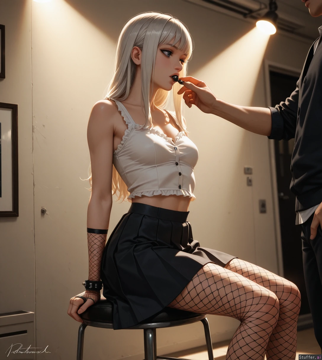 (((Ultra HD), (perfect lighting), photorealistic), professional light, HDR, best quality, masterpiece, hyper detailed), ash hair 1woman, long hair, beautiful face, girl, emo girl, punk girl, photomodel, pleated skirt, (buttoned blouse), fishnets_legwear, fishnets_gloves, sitting, on stool, professional photo_studio, white space, narrow_waist:1.5, (thin_body:1.5), mascara, male_feeding_hand