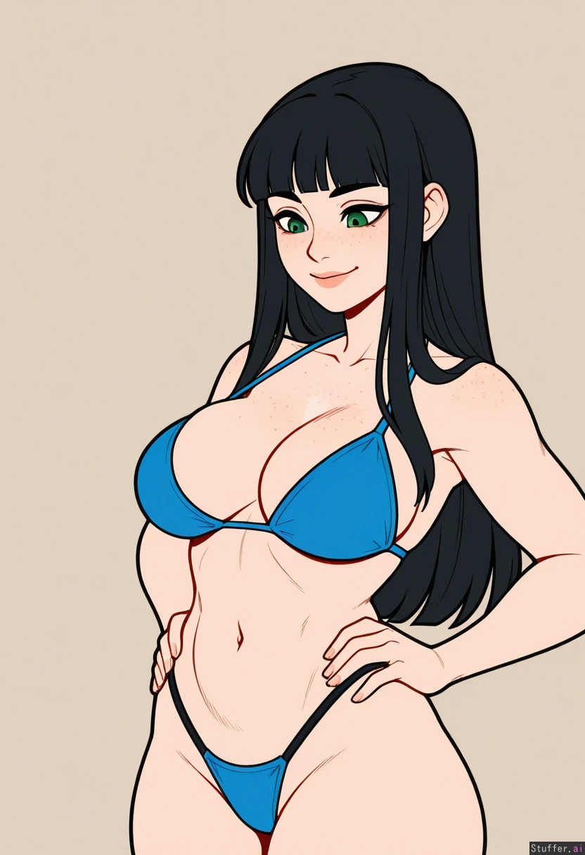 (Kinkymation(artist):0.5), (pudgeruffian(artist):0.3), Beige background, 1girl, solo, (simple style), ((less detail)), ((flat colors)), black hair, long hair, blunt bangs, round eyes, green eyes, eye liner, cute face, freckles, looking down at self, smiling, light skin, hands on hips, ((eyes open)), (Blue bikini, black thong) (Slim body), (Athletic build), (Shapely boobs),