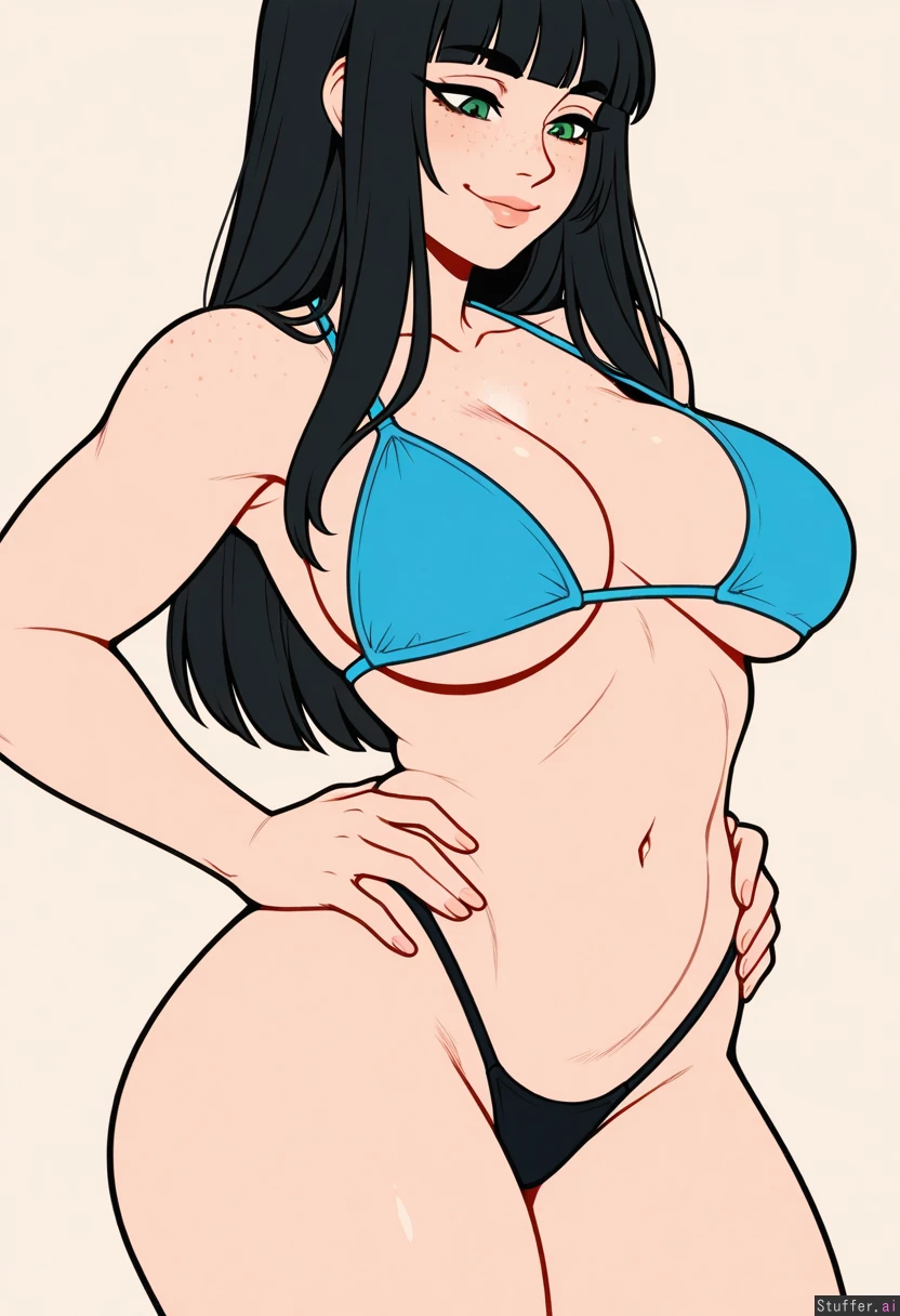 (Kinkymation(artist):0.5), (pudgeruffian(artist):0.3), Beige background, 1girl, solo, (simple style), ((less detail)), ((flat colors)), black hair, long hair, blunt bangs, round eyes, green eyes, eye liner, cute face, freckles, looking down at self, smiling, light skin, hands on hips, ((eyes open)), (Blue bikini, black thong) (Slim body), (Athletic build), (Shapely boobs),