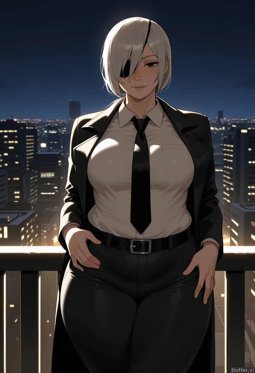 solo, masterpiece, amazing resolution, nyantcha(artist), krekkov(artist), dramatic lighting, intricate details, detailed eyes, hdr, best quality, (soft shading), dim lighting, realistic lighting, standing, teasing (hand on hip), looking at viewer, 1woman, (((Quanxi from Chainsaw Man))), ((alt mommy)), parted hime-cut straight_hair, dark brown eyes, (left eye covered), flirty, silver hair with silver highlights, her bangs are silver, wide hips, thick thighs, medium breasts, (chubby belly:1.2), tummy pooch, legs crossed, focused, sweet, nave, flushed, ((chubby:1.6)), chubby figure, fatass, large protruding belly, White collared shirt, shirt tucked into pants, leather dress belt, black trench coat, no collar, black neck tie, black suit pants, black eyepatch, Rooftop, urban, outside,