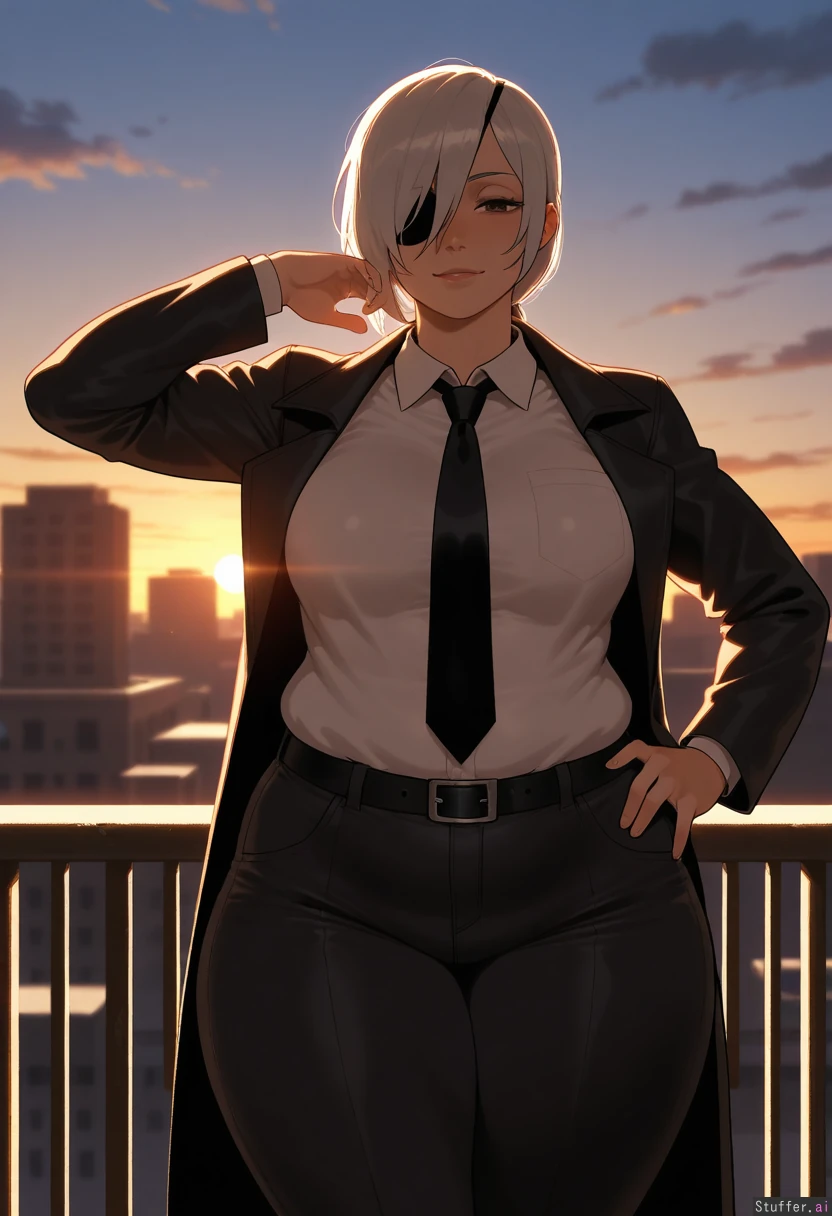 solo, masterpiece, amazing resolution, nyantcha(artist), krekkov(artist), dramatic lighting, intricate details, detailed eyes, hdr, best quality, (soft shading), dim lighting, realistic lighting, standing, teasing (hand on hip), looking at viewer, 1woman, (((Quanxi from Chainsaw Man))), ((alt mommy)), parted hime-cut straight_hair, dark brown eyes, (left eye covered), flirty, silver hair with silver highlights, her bangs are silver, wide hips, (thick thighs:1.2), medium breasts, (chubby belly:1.2), tummy pooch, legs crossed, focused, sweet, nave, flushed, ((chubby:1.6)), chubby figure, fatass, large protruding belly, White collared shirt, shirt tucked into pants, leather dress belt, black trench coat, no collar, black neck tie, black suit pants, black eyepatch, Rooftop, urban, outside, sunset,