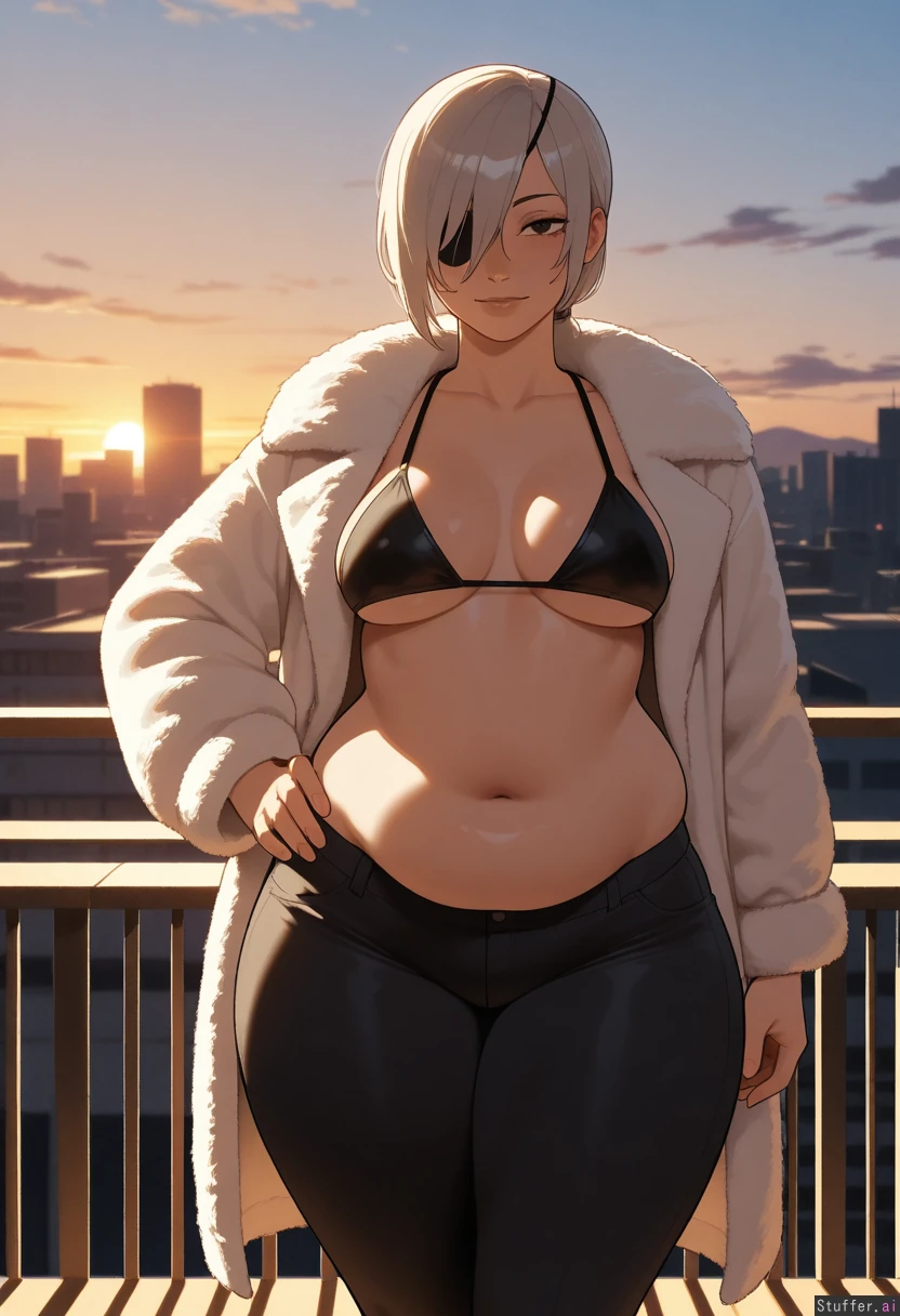solo, masterpiece, amazing resolution, nyantcha(artist), krekkov(artist), dramatic lighting, intricate details, detailed eyes, hdr, best quality, (soft shading), dim lighting, realistic lighting, standing, teasing (hand on hip), looking at viewer, 1woman, (((Quanxi from Chainsaw Man))), ((alt mommy)), parted hime-cut straight_hair, dark brown eyes, (left eye covered), flirty, silver hair with silver highlights, her bangs are silver, wide hips, (thick thighs:1.5), medium breasts, (chubby belly:1.2), tummy pooch, legs crossed, focused, sweet, nave, flushed, ((chubby:1.6)), chubby figure, fatass, large protruding belly, Black bikini top, white puffer fur coat, no collar, black suit pants, black eyepatch, Rooftop, urban, outside, sunset,