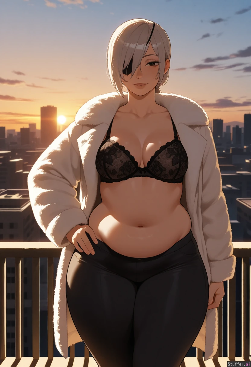 solo, masterpiece, amazing resolution, nyantcha(artist), krekkov(artist), dramatic lighting, intricate details, detailed eyes, hdr, best quality, (soft shading), dim lighting, realistic lighting, standing, teasing (hand on hip), looking at viewer, 1woman, (((Quanxi from Chainsaw Man))), ((alt mommy)), parted hime-cut straight_hair, dark brown eyes, (left eye covered), flirty, silver hair with silver highlights, her bangs are silver, wide hips, (thick thighs:1.5), medium breasts, (chubby belly:1.2), tummy pooch, legs crossed, focused, sweet, nave, flushed, ((chubby:1.6)), chubby figure, fatass, large protruding belly, Black embroidered bra, white puffer fur coat, no collar, black suit pants, black eyepatch, Rooftop, urban, outside, sunset,