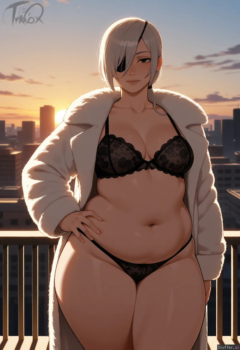 solo, masterpiece, amazing resolution, nyantcha(artist), krekkov(artist), dramatic lighting, intricate details, detailed eyes, hdr, best quality, (soft shading), dim lighting, realistic lighting, standing, teasing (hand on hip), looking at viewer, 1woman, (((Quanxi from Chainsaw Man))), ((alt mommy)), parted hime-cut straight_hair, dark brown eyes, (left eye covered), flirty, silver hair with silver highlights, her bangs are silver, wide hips, (thick thighs:1.5), medium breasts, (chubby belly:1.2), tummy pooch, legs crossed, focused, sweet, nave, flushed, ((fat:1.6)), chubby figure, fatass, large protruding belly, Black embroidered bra, white puffer fur coat, no collar, black panties, black eyepatch, Rooftop, urban, outside, sunset,
