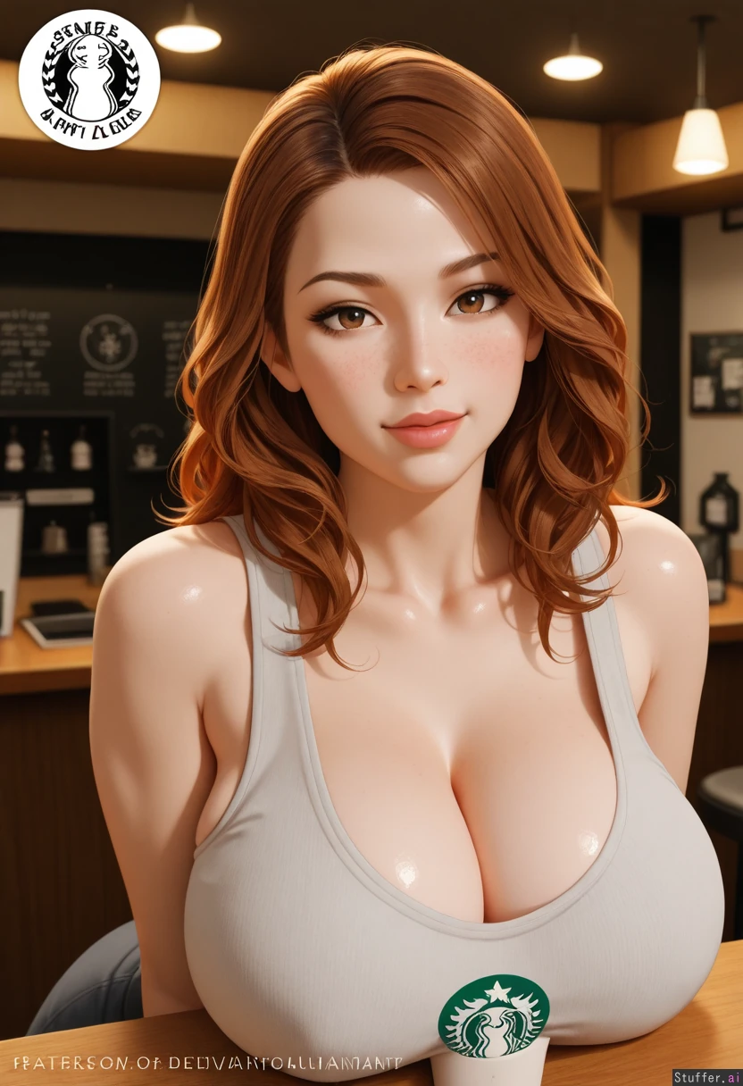 (masterpiece artwork, deviantart, high_resolution, professional_quality, best_rating, detailed female body, exceptional clarity, 3D_erotica, global_illumination, volumetric_lighting, blended_shading, sense of depth, sense of scale), highly realistic, beautiful, (fair pale skin), attractive face, slim face, voluptuous body, narrow shoulders, freckles, heavy , starbucks , 1girl , brown_hair , eyes brown, latina