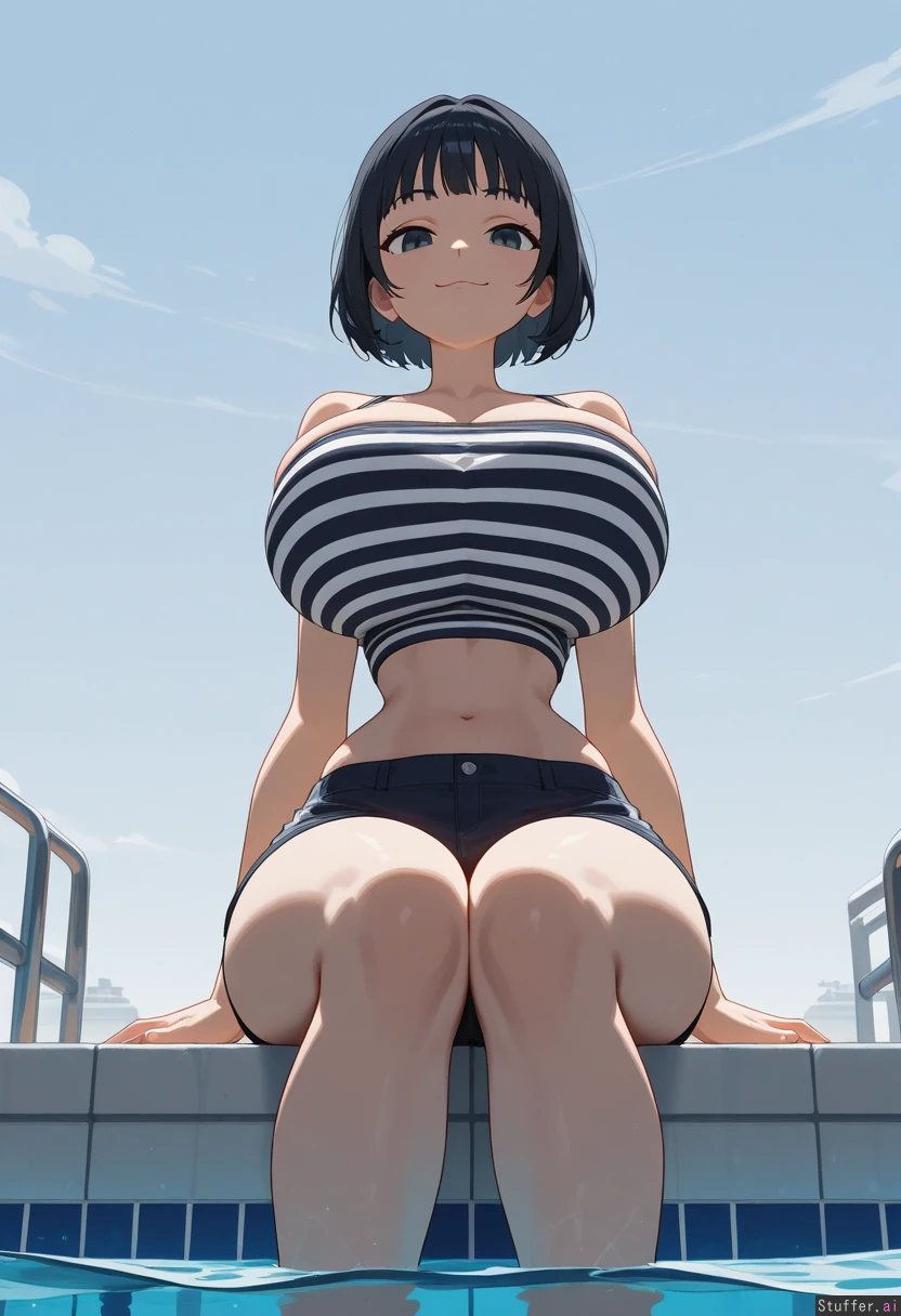 striped tube top, hips_wider_than_shoulders, wide hips, huge breasts, arms at sides, bangs, large eyes, knees together, front view, sitting, poolside, straight-on, midriff, (narrow waist:1.2), short hair, cloth strap, bursting_breasts, viewed_from_below, full_body, flat_colors, smug