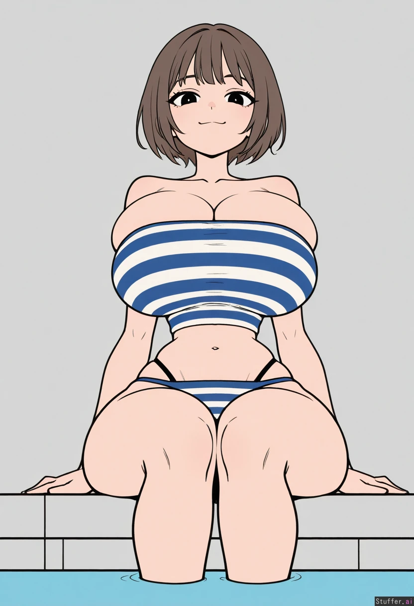 striped tube top, hips_wider_than_shoulders, wide hips, huge breasts, arms at sides, bangs, large eyes, knees together, front view, sitting, poolside, straight-on, midriff, (narrow waist:1.2), short hair, cloth strap, bursting_breasts, viewed_from_below, full_body, smug, ((flat_color, simple style, less detail)), bikini_bottom