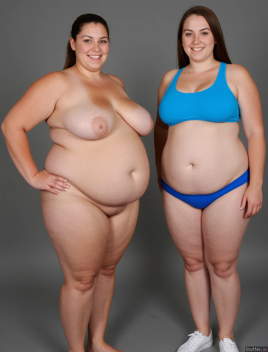full body image naked smiling tan lines:1.4, (morbidly obese woman with huge belly) (The other woman is very thin:1.6 slim:1.6 skinny:1.6) fat and very skinny