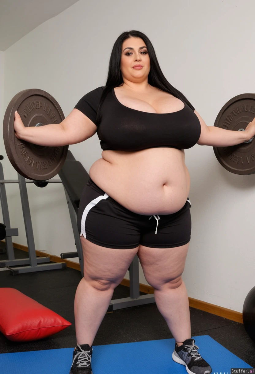 (full body view:1.5) arabe woman solo, long black hair, 50 years old, tall, perfect eyes, beautiful face dressed in (skinny shorts:1.5), (black crop top:1.5) gym room (huge oversized round breasts:1.5), wide waist, (fat body:1.5), round ass photorealistic, natural lighting, head up, ((((view of both legs))))