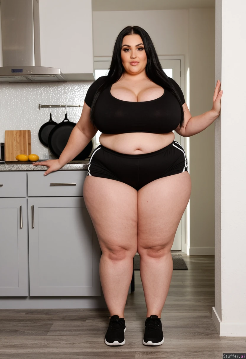 (full body view:1.5) arabe woman solo, long black hair, 50 years old, tall, perfect eyes, beautiful face dressed in (skinny shorts:1.5), (black crop top:1.5) cook room (huge oversized round breasts:1.5), wide waist, (fat body:1.5), round ass photorealistic, natural lighting, head up, ((((view of both legs))))