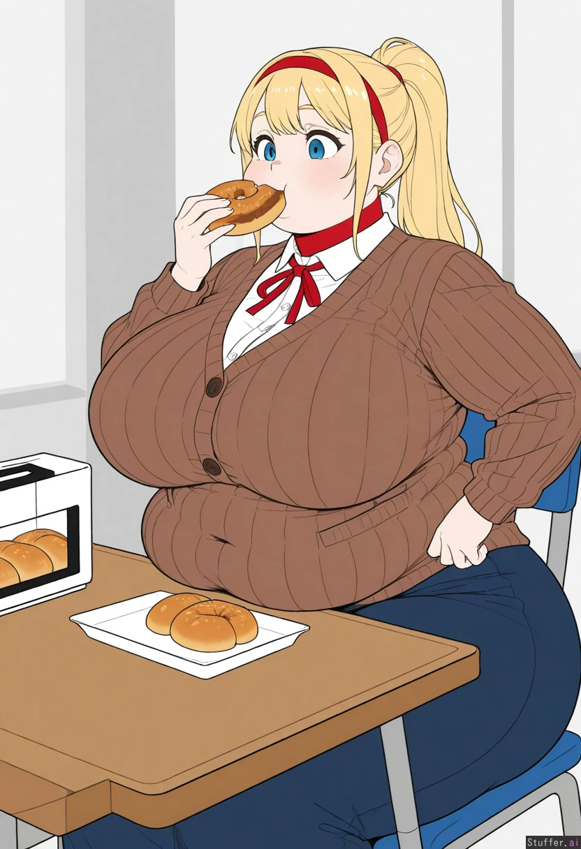 ((Flat colors)), solo, 1girl, (Covered navel, ribbed green long sleeve button sweater, brown cardigan, white long sleeve shirt, blue skirt, red neck ribbon, red hairband), Long blonde ponytail, blonde bangs, blue eyes, pale skin, short, (Sitting down next to table, eating donuts), mayor office, Morbidly Obese, weight gain, love handles, (Fat round face, chubby cheeks, fat arms), Huge breasts, plump breasts, wide spread breasts, huge hips, wide hips, hips_wider_than_shoulders, huge ass, huge butt, huge thighs, thicc thighs