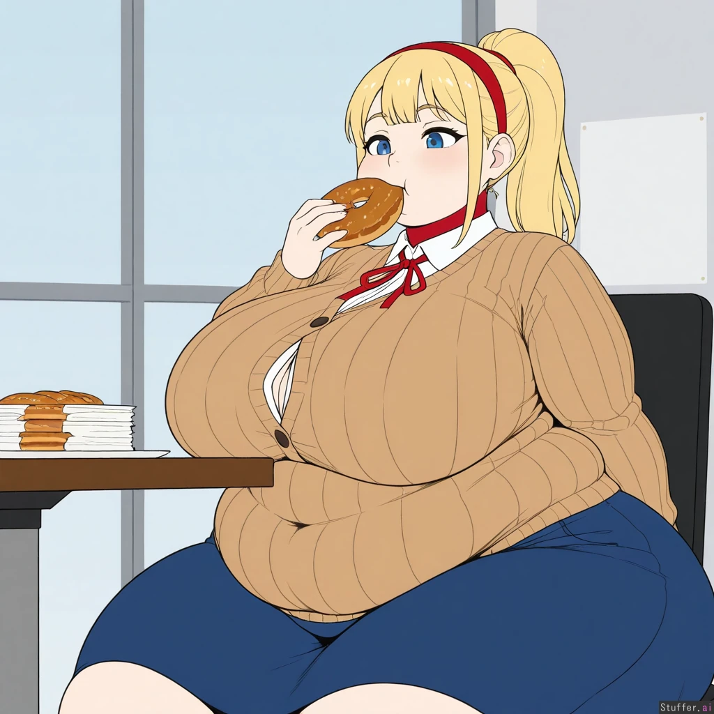 ((Flat colors)), solo, 1girl, (Covered navel, ribbed green long sleeve button sweater, brown cardigan, white long sleeve shirt, blue skirt, red neck ribbon, red hairband), tight clothes, button gap, Long blonde ponytail, blonde bangs, blue eyes, pale skin, short, (Sitting down next to table, eating donuts), mayor office, (Morbidly Obese, weight gain, fatter, love handles), (Fat round face, chubby cheeks, fat arms), Huge breasts, plump breasts, wide spread breasts, huge hips, wide hips, hips_wider_than_shoulders, huge ass, huge butt, huge thighs, thicc thighs