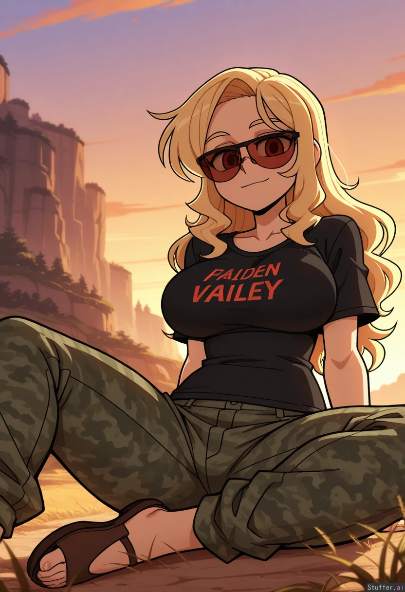 masterpiece, best quality, amazing quality, 1woman, sitting crosslegged on ground, low angle, skinny body, svelte, (big boobs: 0.8), baggy black t shirt, camo pants, long wavy blonde hair, anime style, red sunglasses, light smile, (thick thighs: 0.7), alpine valley background, golden hour, vanripper_(style)