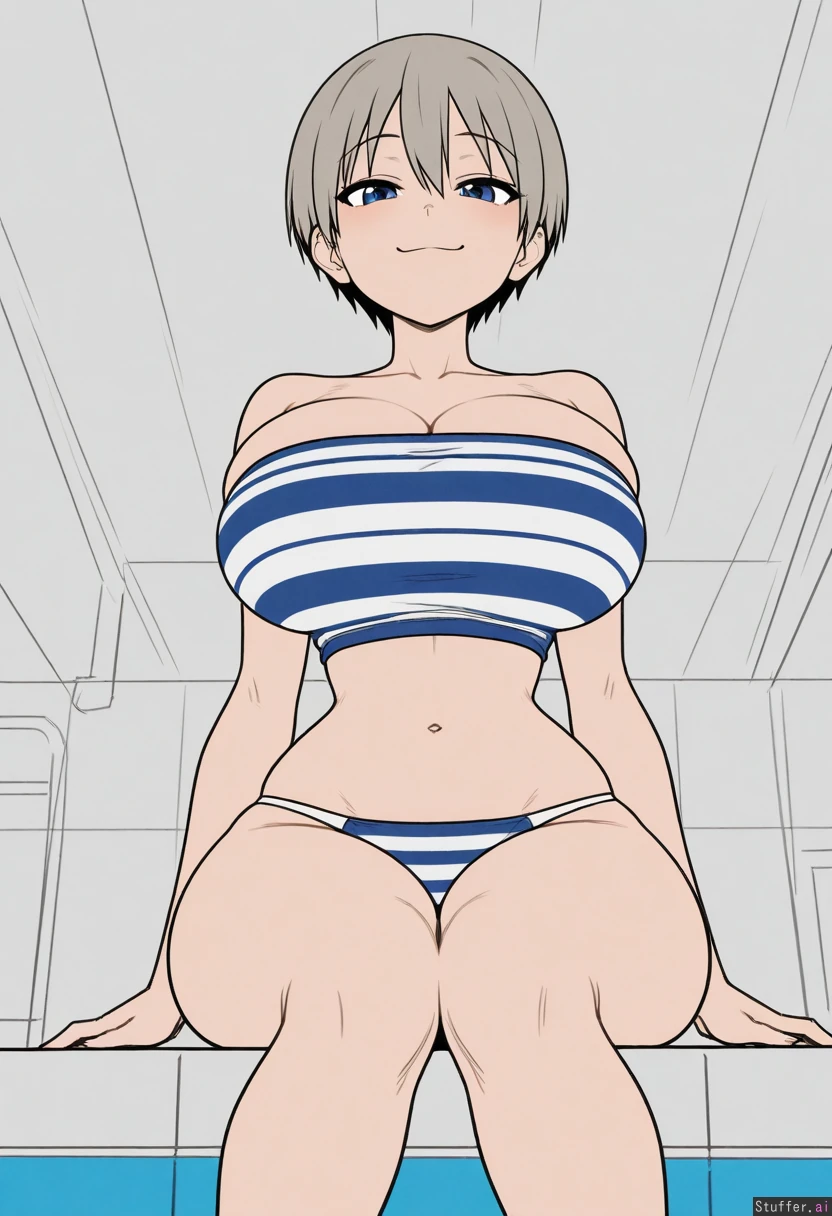 Uzaki Hana, striped tube top, hips_wider_than_shoulders, wide hips, huge breasts, arms at sides, knees together, front view, sitting, poolside, straight-on, midriff, (narrow waist:1.2), cloth strap, bursting_breasts, viewed_from_below, full_body, smug, ((flat_color, simple style, less detail)), bikini_bottom