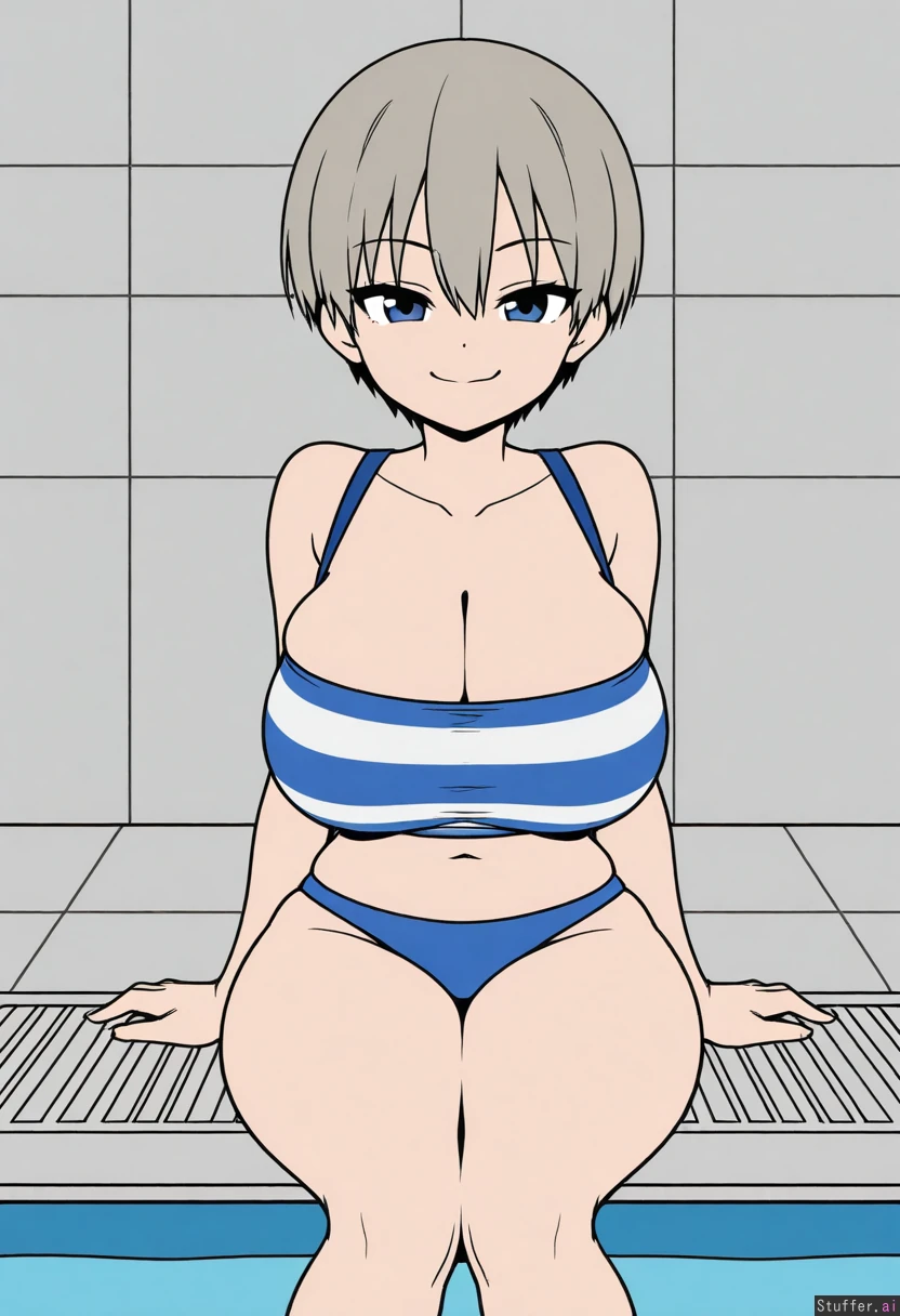 Uzaki Hana, striped tube top, hips_wider_than_shoulders, wide hips, huge breasts, arms at sides, knees together, front view, sitting, poolside, straight-on, midriff, (narrow waist:1.2), (cloth strap), full_body, smug, ((flat_color, simple style, less detail)), bikini_bottom