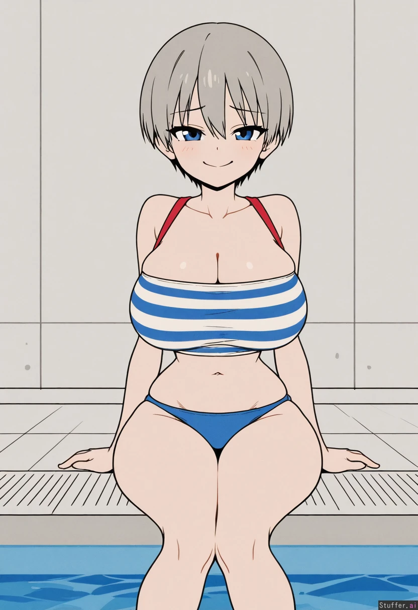 Uzaki Hana, striped tube top, hips_wider_than_shoulders, wide hips, huge breasts, arms at sides, knees together, front view, sitting, poolside, straight-on, midriff, (narrow waist:1.2), (cloth strap), full_body, smug, ((flat_color, simple style, less detail)), bikini_bottom, (viewed_from_below:0.8)