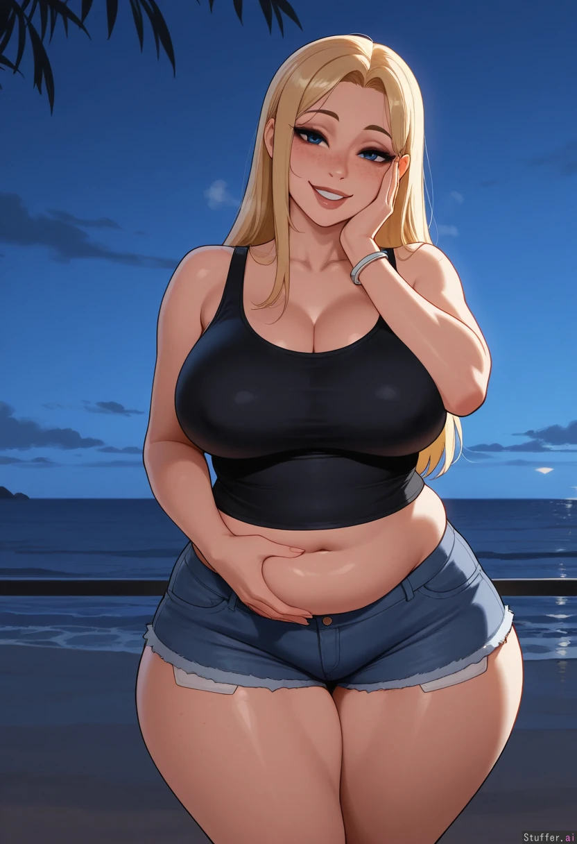 nyantcha:1.2), (krekkov:1.4), (reiq:1.1), (kittew:1.3), best quality, intricate details, hdr, detailed eyes, (soft shading), realistic, dim lighting, realistic lighting, 1woman, ((Yuki Tsukumo from Jujutsu Kaisen)), ((chubby goth mommy)), short-ish hair down middle-part straight_hair, standing, teasing (caressing cheeks with own hands), looking at viewer (front view), flirty, blonde hair with blonde highlighted tips, dark blue eyes, black eyeshadow and eyeliner, lots of freckles, her bangs are blonde, wide hips, ((thick thighs:1.4)), large breasts, (chubby belly:2.0), tummy pooch, legs crossed, happy, sweet, nave, flushed, ((chubby:1.3)), chubby figure, fatass, large protruding belly, Black tank top, no bra, red baggy jeans, white bracelets, Beach at evening,